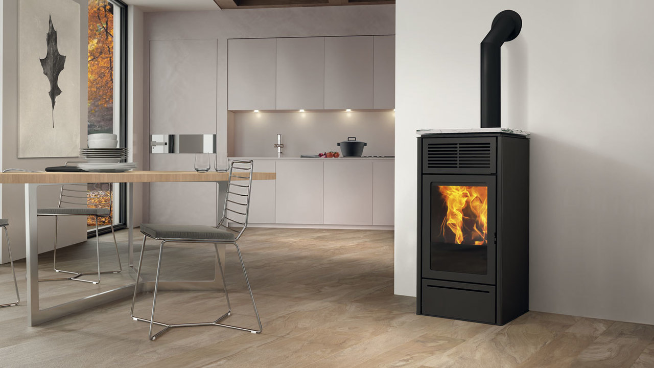 Σόμπα pellet Slide της Edilkamin . Συρόμενο καπάκι για τη φόρτωση pellet.